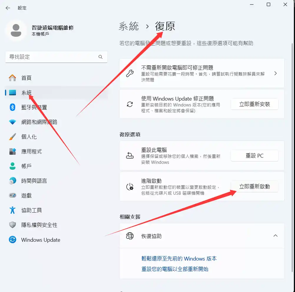 組合鍵叫出「設定」App,然後點選左側的「系統」,接著在右方找到並點擊「復原」。在「進階啟動」區塊旁,點擊「立即重新啟動」。