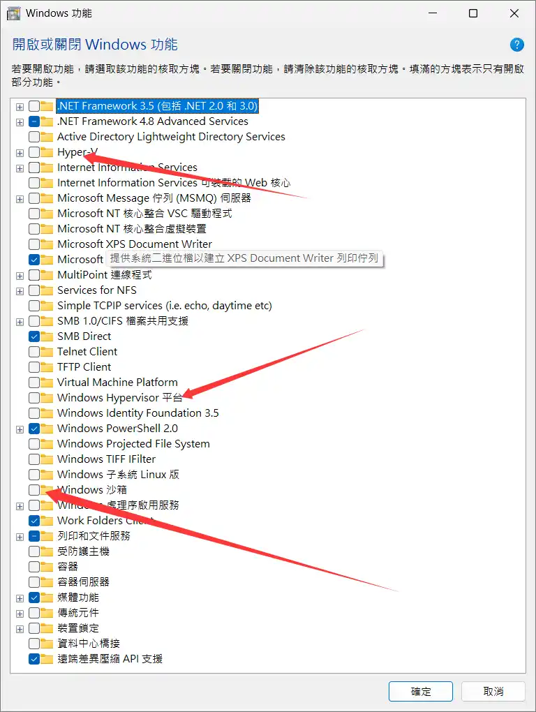 如果你的實體電腦 (Host) 有啟用 Windows 內建的 Hyper-V 功能,它可能會跟 VirtualBox「打架」,導致虛擬機無法正常開機。所以,建議先把 Hyper-V 關掉。