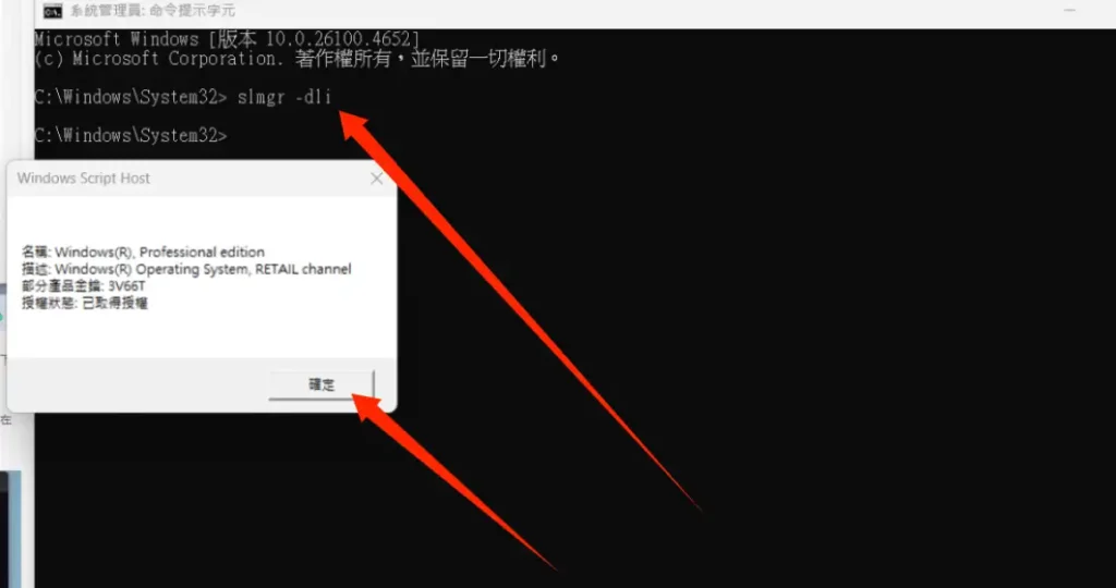 步驟二: 接著,在跳出來的黑色視窗(也就是命令提示字元)裡,直接輸入 slmgr -dli 這串指令,然後按下 Enter